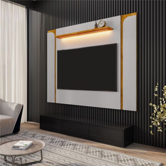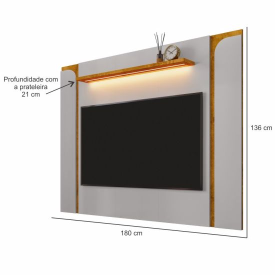 Painel suspenso Maresias, design funcional que realça cada canto da sua casa! Estrutura em MDP (15/25 mm) com acabamento em tinta UV. Possui uma prateleira superior (MDP 25 mm) com LED integrado, passagem de cabos embutida e detalhes laterais fresados com bordas curvas. Suporta televisores de até 75 polegadas com segurança. Este produto será entregue em 1 volume.