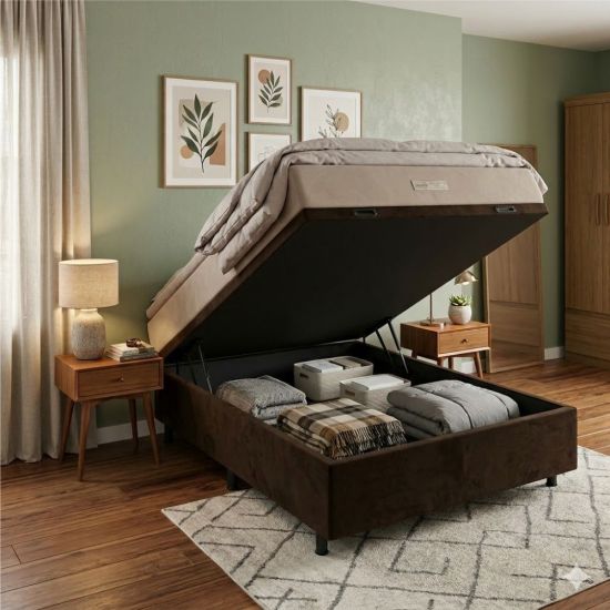 Base Box Casal com Baú, uma ótima opção para você que gosta de um cômodo organizado e com um visual impecável, é o Box Baú. Nela você poderá acomodar o seu colchão perfeitamente e ainda armazenar travesseiros ou cobertas em seu baú, assim você economiza espaço no quarto com muita facilidade, basta levantar o tampo!