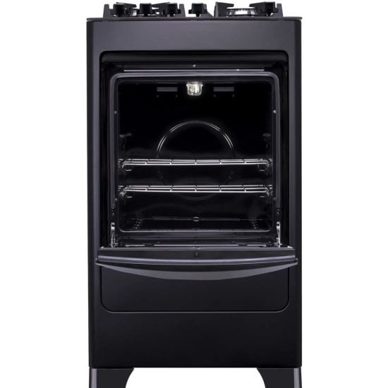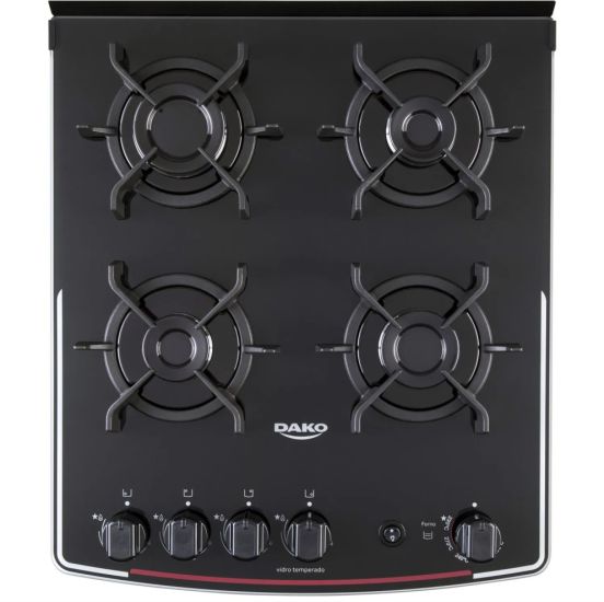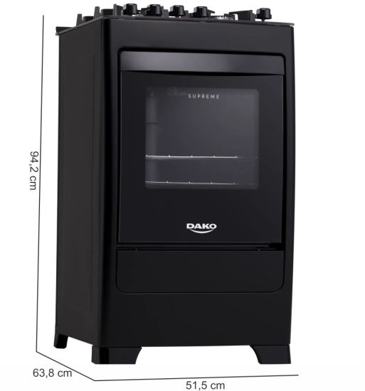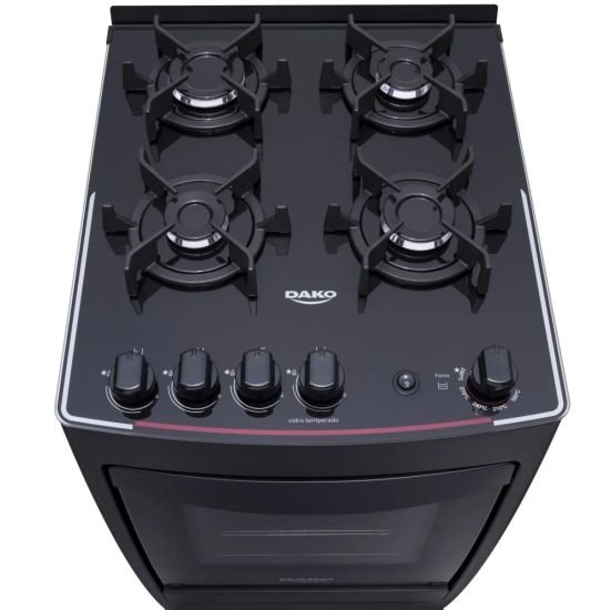 Descrição: Fogão 4 Bocas Preto com Mesa de Vidro Dako Supreme Glass: design e acabamento de dar água na boca! Com mesa de vidro temperado sem moldura e top control, o fogão ainda conta com botões removíveis, que permitem mais facilidade na hora da limpeza. Além disso, é equipado com trempes de ferro fundido e acendimento automático. A versão 4 bocas possui 2 queimadores de 1,7kW, 1 queimador Família de 2,0kW e 1 queimador Mega Chama de 3,0kW. O forno possui excelente capacidade de 60 litros, com dimensões de 37 x 36 x 45 cm (largura x altura x profundidade), acabamento limpa fácil, iluminação interna (lâmpada acompanha o produto), duas grades deslizantes e porta com vidro duplo – que preserva o calor.
