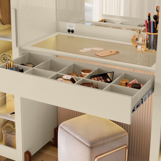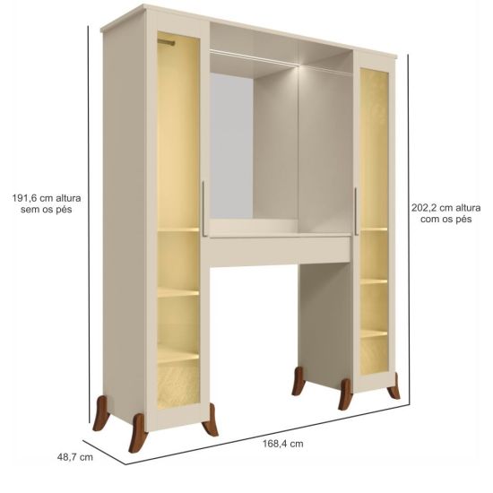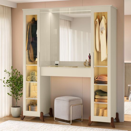Camarim Star Reflecta RV Móveis é ideal para quem deseja transformar o momento de se arrumar em uma experiência prática e prazerosa. Mais que um móvel, ele cria um cantinho de maquiagem completo, bonito e funcional. Seu diferencial está na iluminação LED com temperatura de cor ideal para maquiagem, garantindo fidelidade nas cores e precisão nos detalhes. O espelho amplo traz mais segurança na finalização, sendo perfeito também para fotos e vídeos. Possui tomada integrada para facilitar o uso de secador, chapinha ou modelador. Na organização, são 6 prateleiras para perfumes, cosméticos e acessórios, mantendo tudo à mão. Os puxadores em MDF, acabamento interno na cor do produto e 8 pés arredondados reforçam estabilidade e visual.